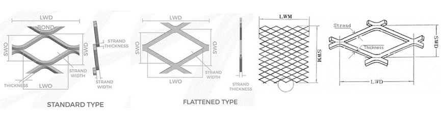 Expanded Metal Mesh is a finished product as it comes from the press after having been die cut and expanded. Each sheet that comes off the expander is in standard or regular form with the junctions at the strands and bonds forming a ridge surface.